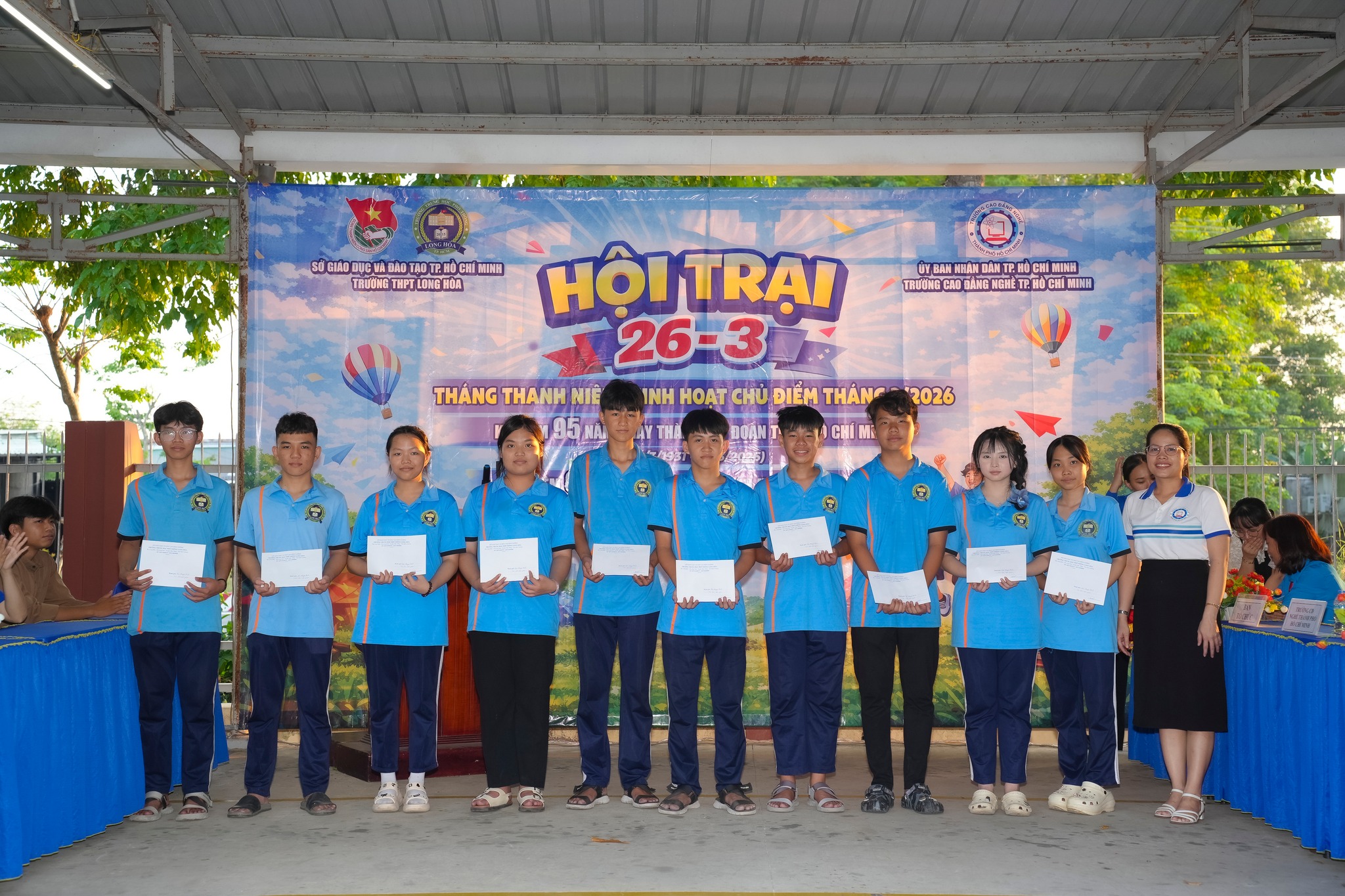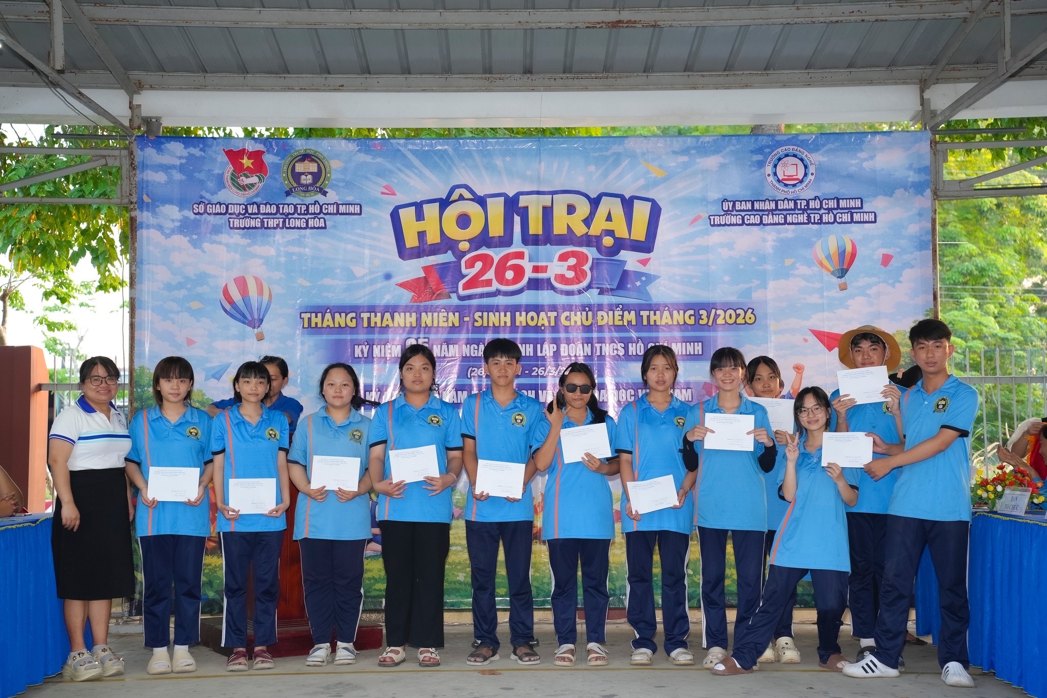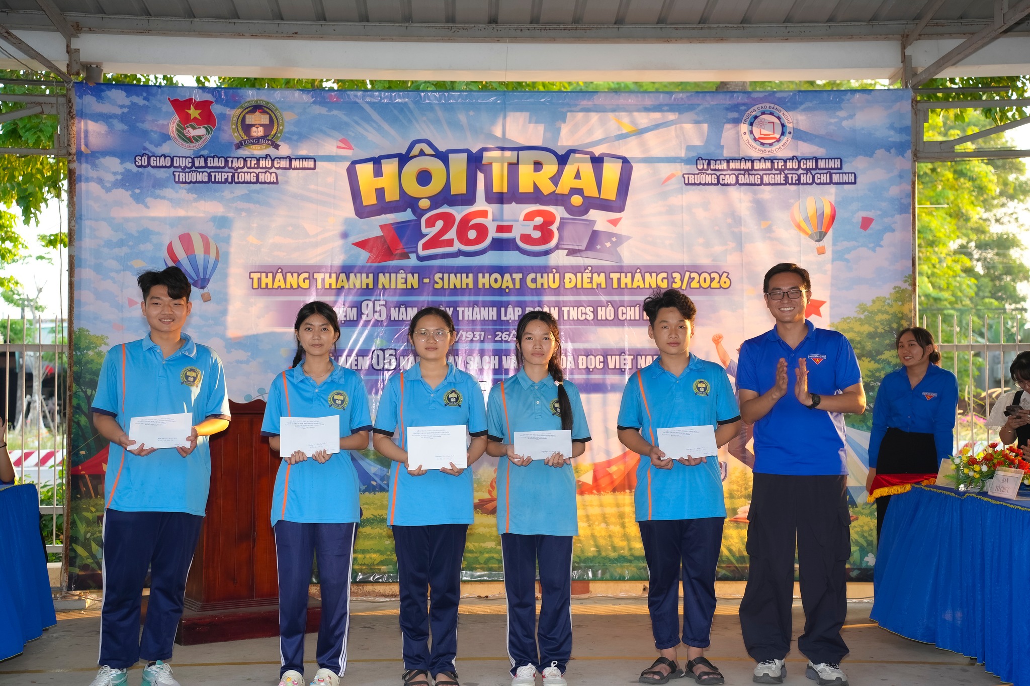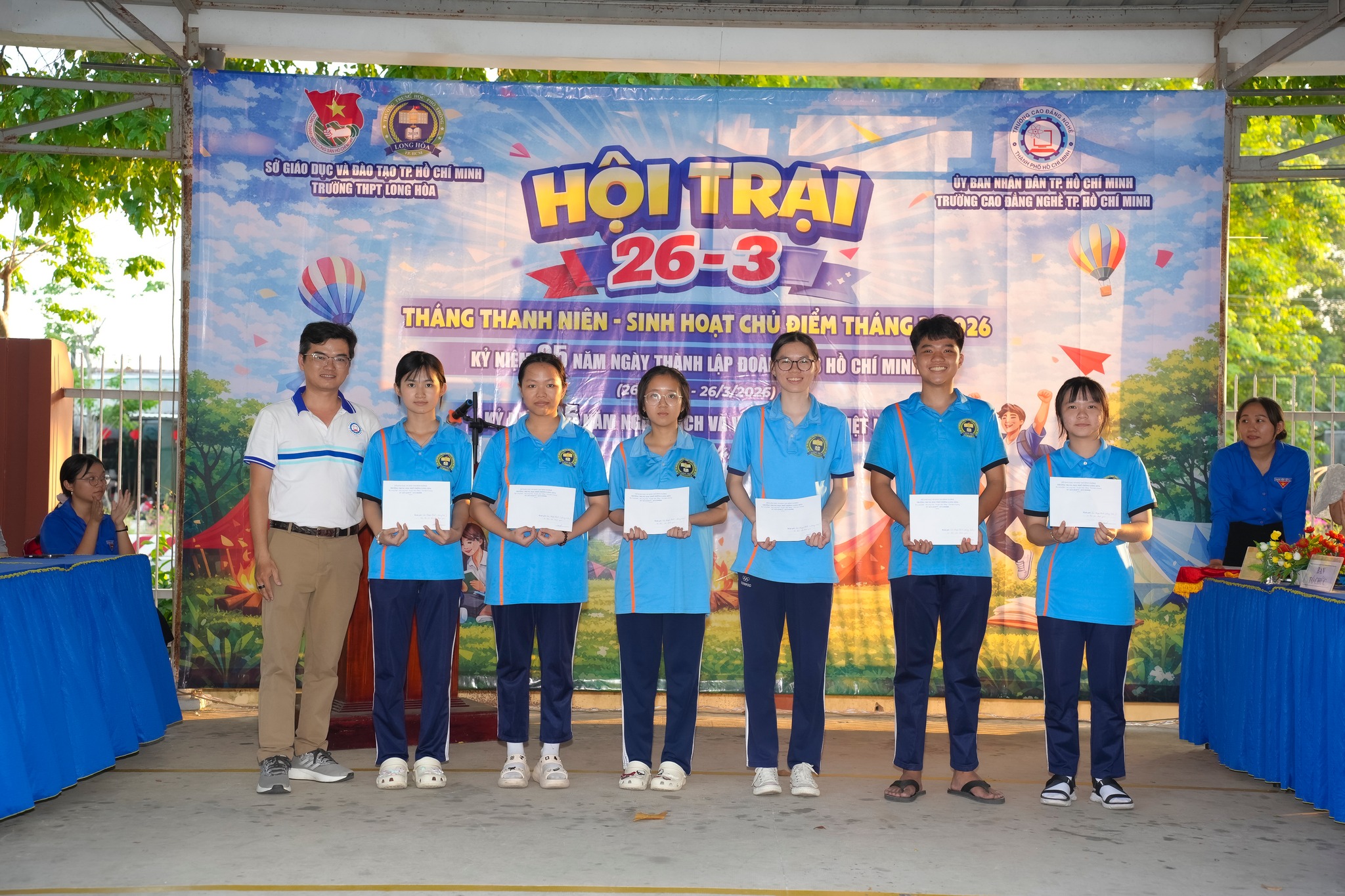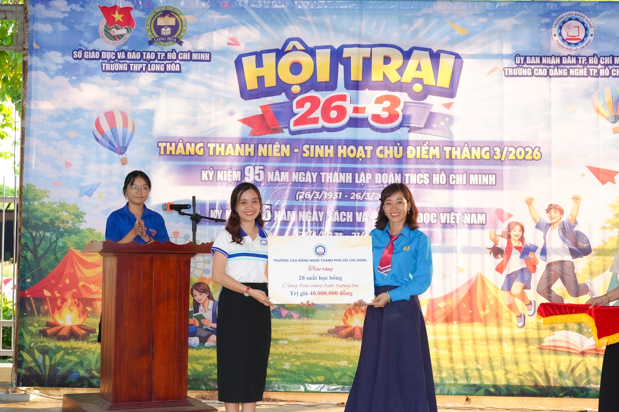 Tại hội trại Trường THPT Long Hòa, Đoàn Thanh niên - Hội Sinh viên Việt Nam Trường phối hợp cùng Phòng Đào tạo - Tuyển sinh Trường Cao đẳng nghề Thành phố Hồ Chí Minh đã trao tặng 20 suất học bổng “Cùng bạn vững bước tương lai” như một lời tiếp sức dành cho các bạn học sinh