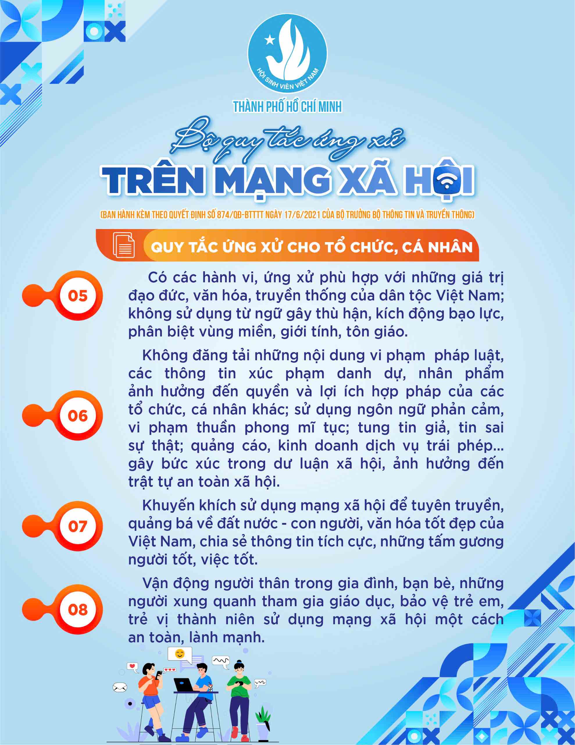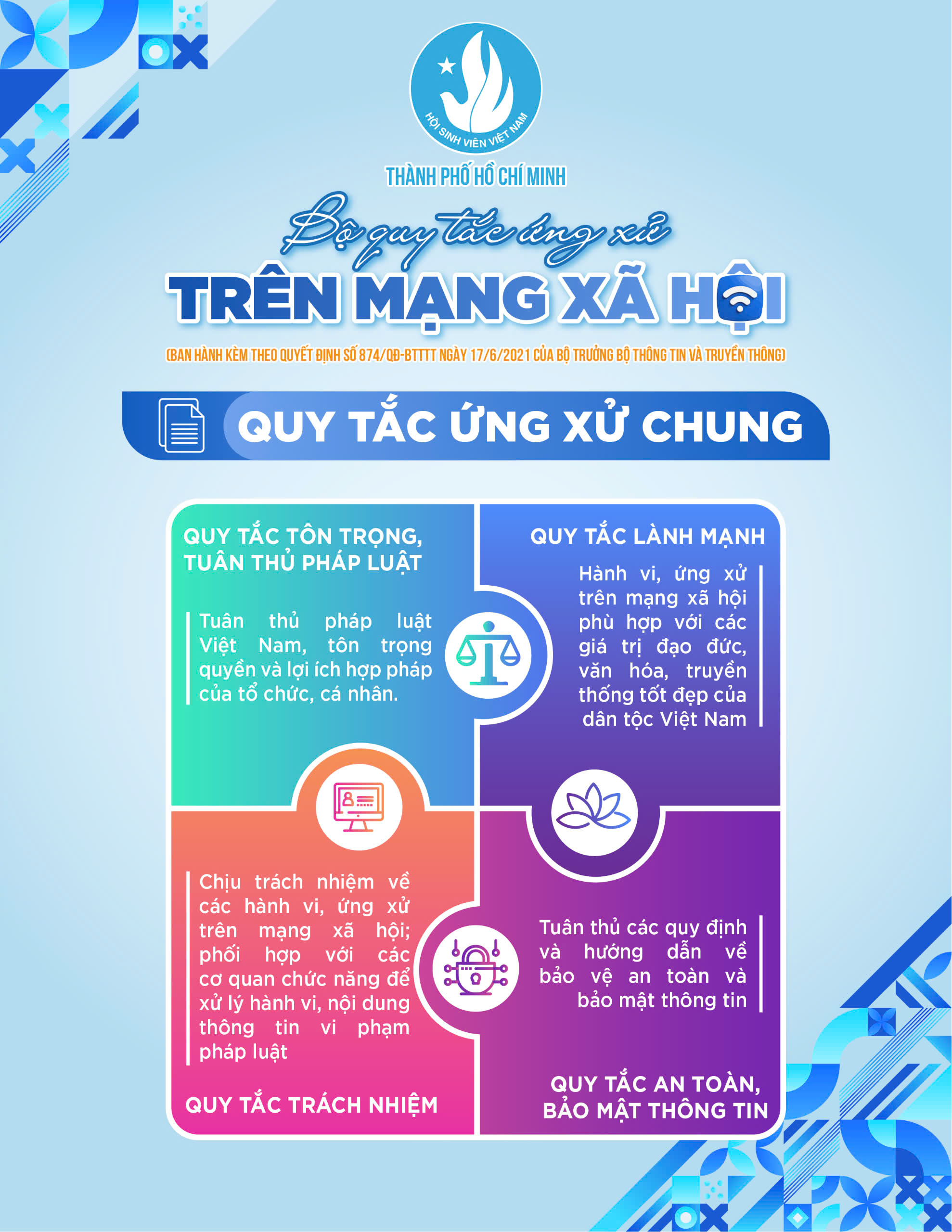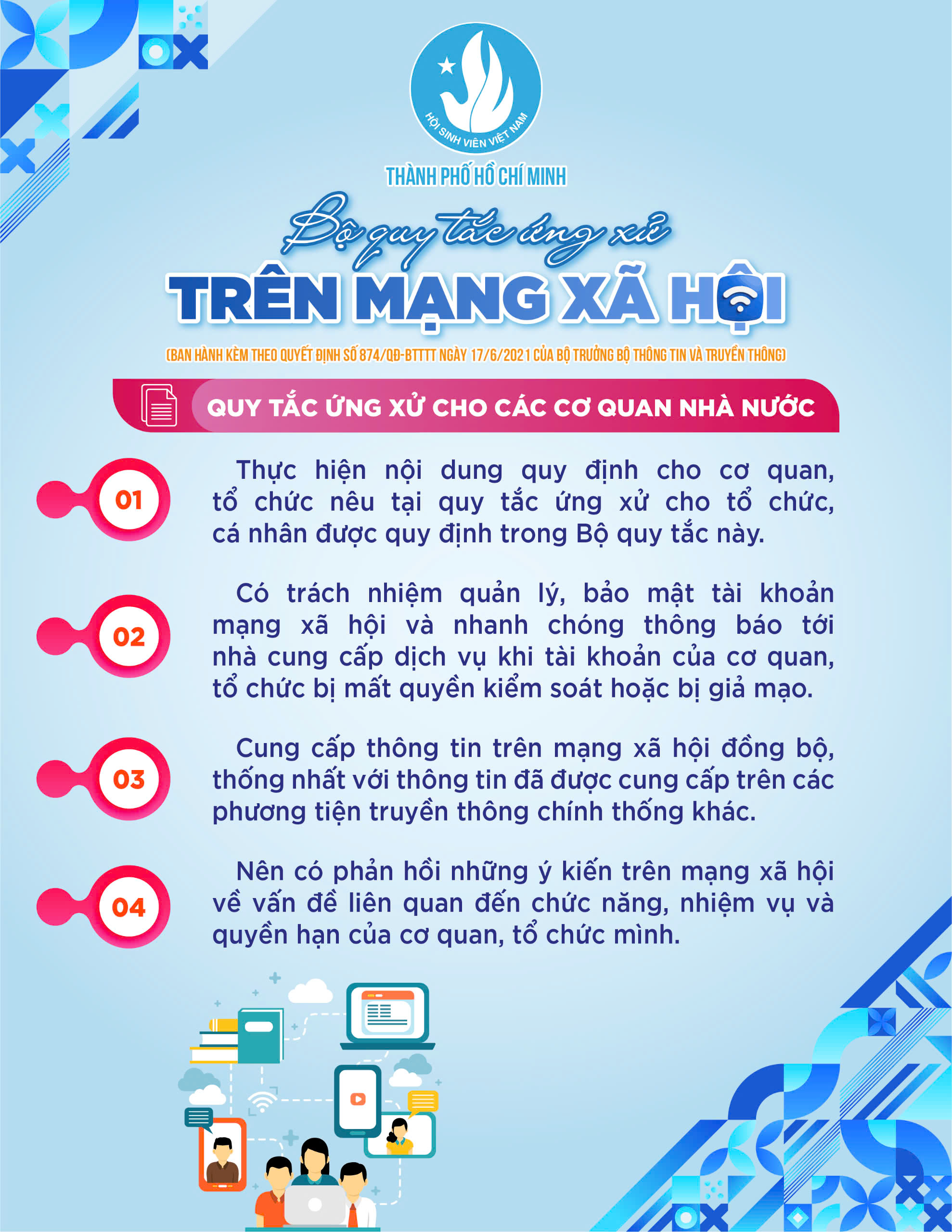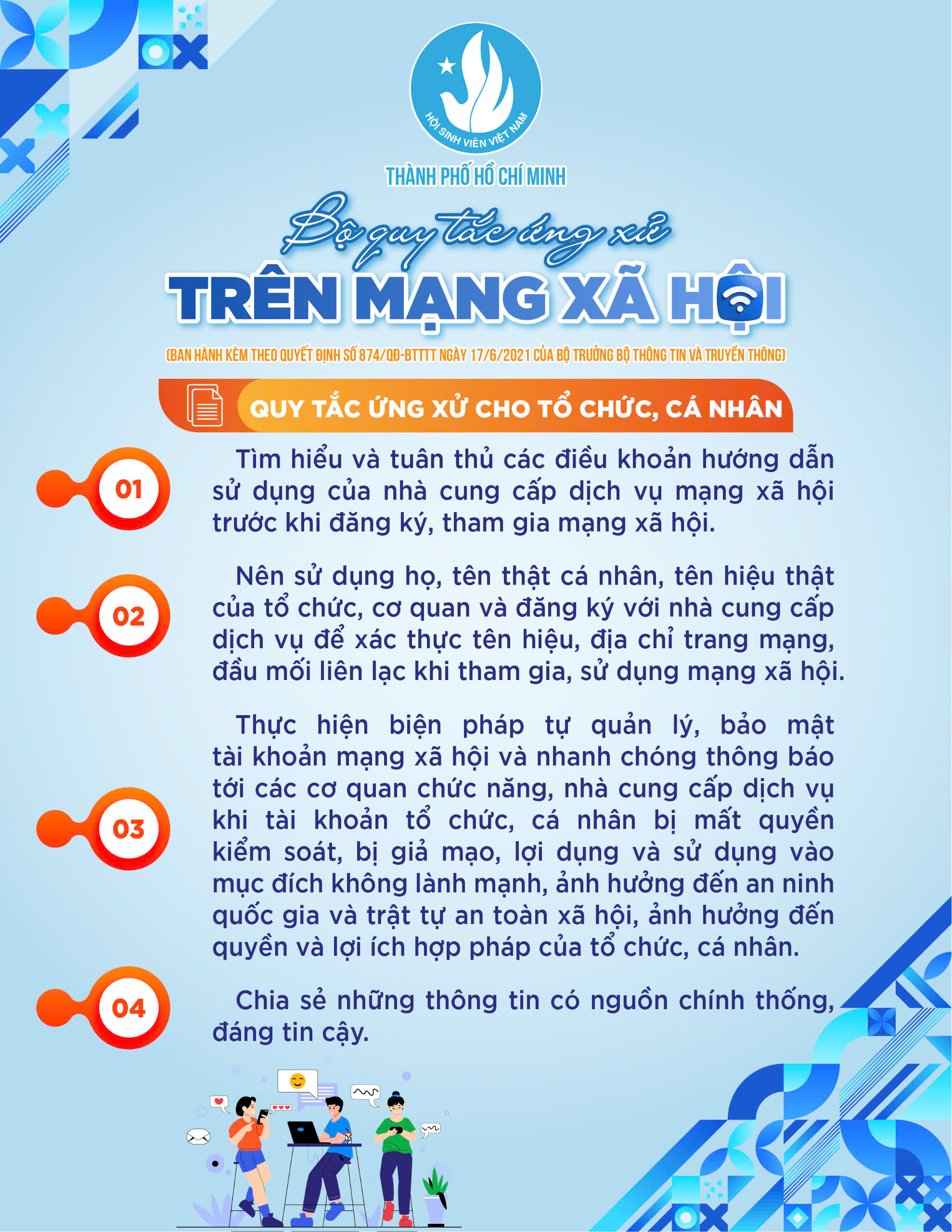 Hội Sinh viên Việt Nam Thành phố giới thiệu đến các bạn Bộ quy tắc ứng xử trên mạng xã hội, được ban hành theo Quyết định số 874/QĐ-BTTTT ngày 17/6/2021 của Bộ Thông tin và Truyền thông.