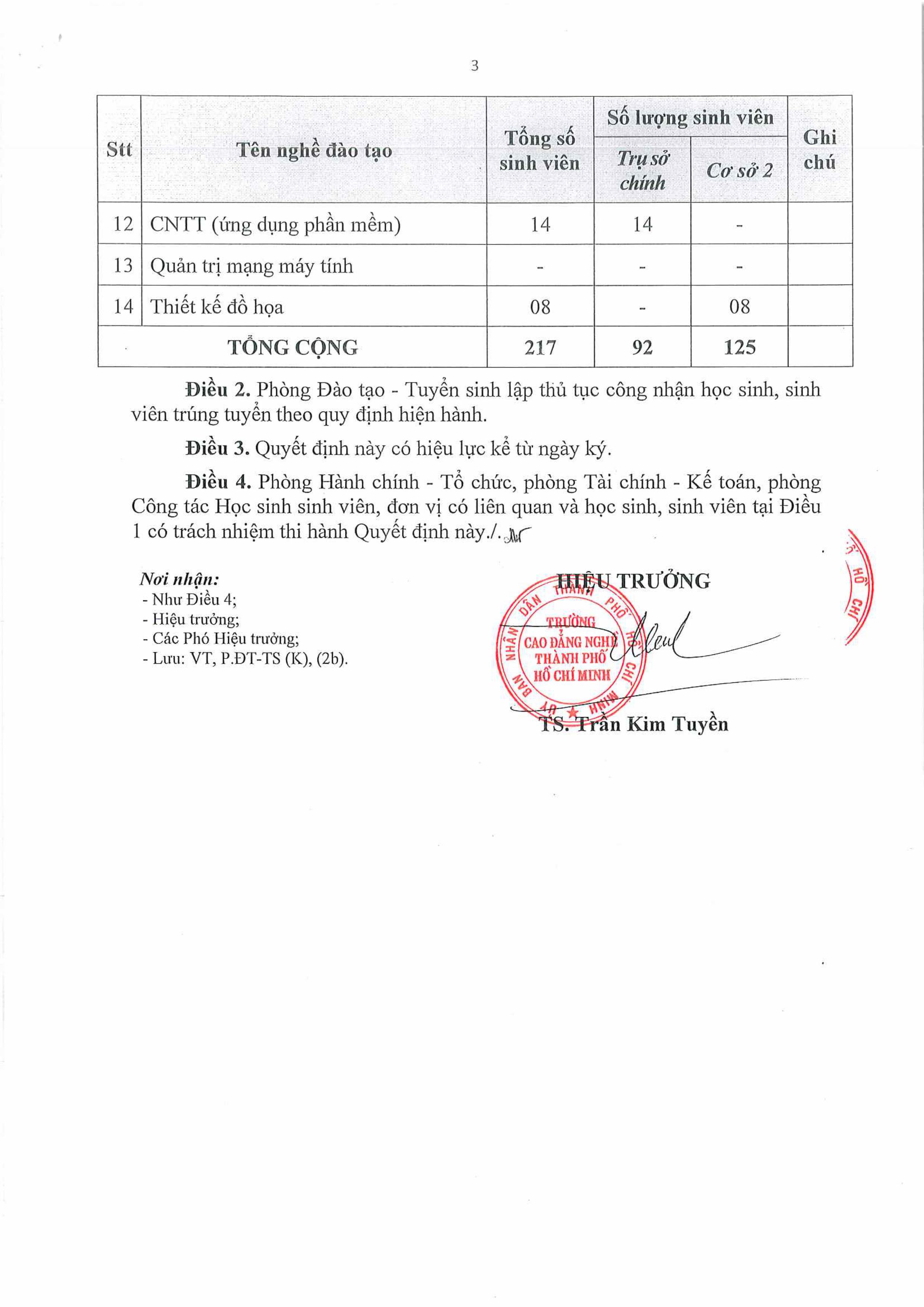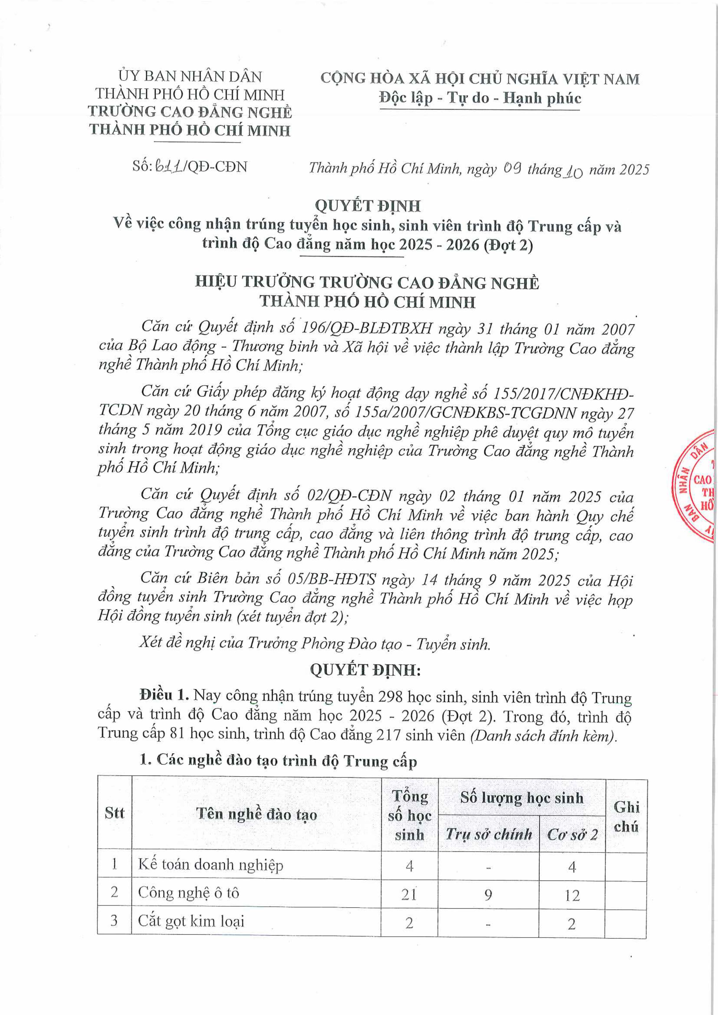 Quyết định công nhận trúng tuyển HSSV Trung cấp và Cao đẳng năm học 2025 - 2026 đợt 2 (Danh sách đính kèm)