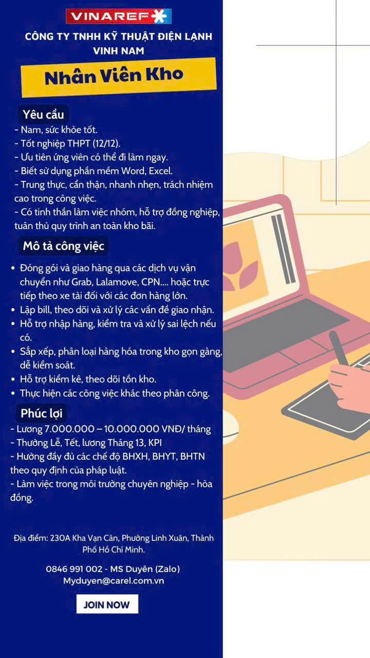 Công ty TNHH Kỹ thuật điện lạnh Vinh Nam (VINAREF) tuyển dụng nhân viên kho